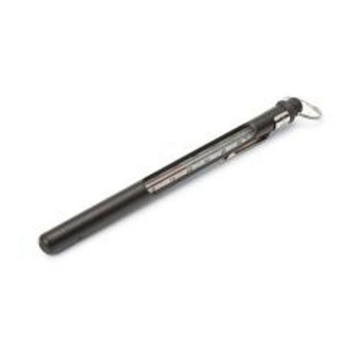 A quality alcohol-filled glass thermometer encased in a sturdy metal housing. Easy-to-read markings indicate temperature in both Fahrenheit and Celsius. Comes with an attached safety loop for a lanyard and a clip to hold it securely in a vest pocket.