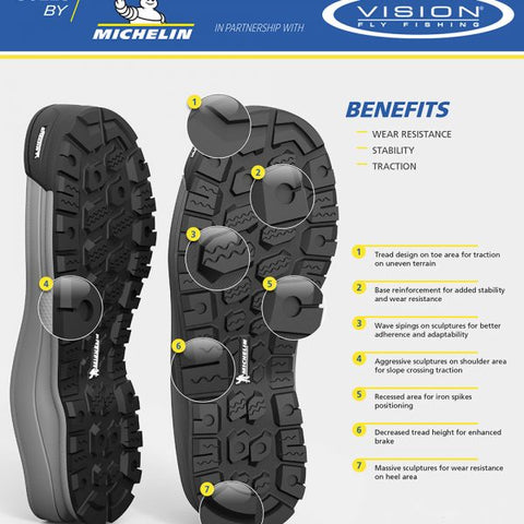 - Michelin rubber sole with built in rubber bumper for ultimate grip and wear resistance