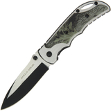 A silver lock knife with partial, grey, leafy, camo overlay on the handle.